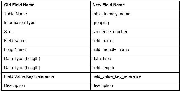 - Field columns with name changes: