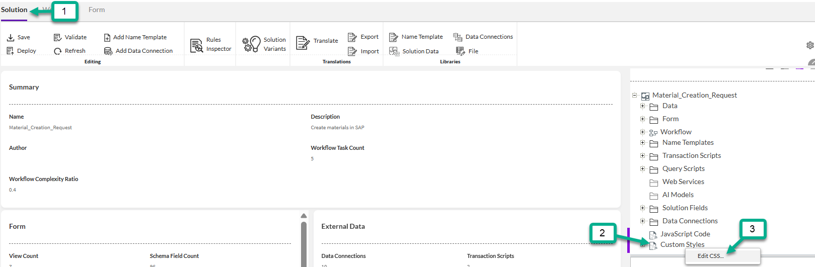 - You may want to consider setting up a "starter" web form template that includes a CSS and other objects your organization wants included as part every web form solution (header, footer, logo, etc.).