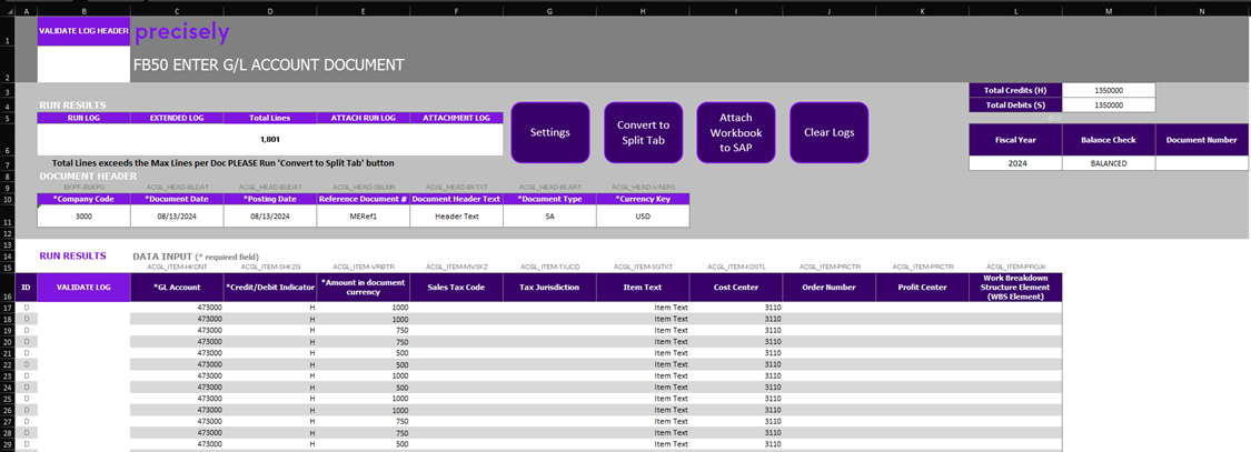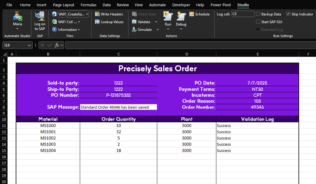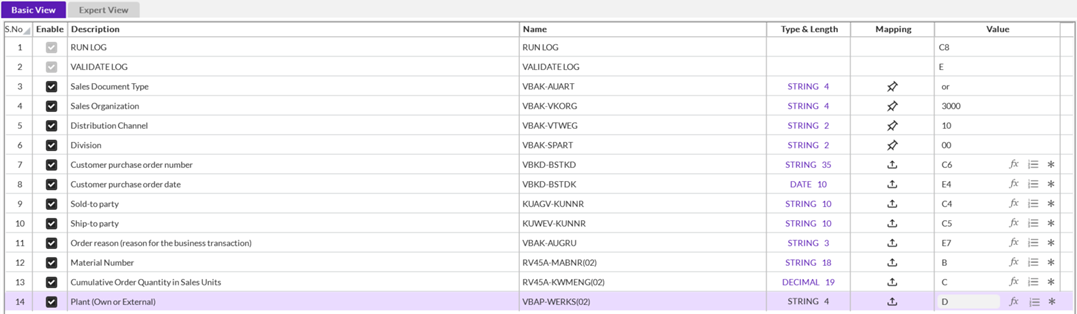 - When you map the script, everything will be mapped to a cell unless you have a loop. If you have a loop then the validate log and SAP fields in the loop will be mapped to columns. Here is an example from the sales order script: