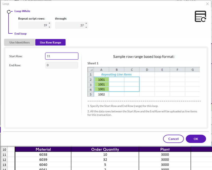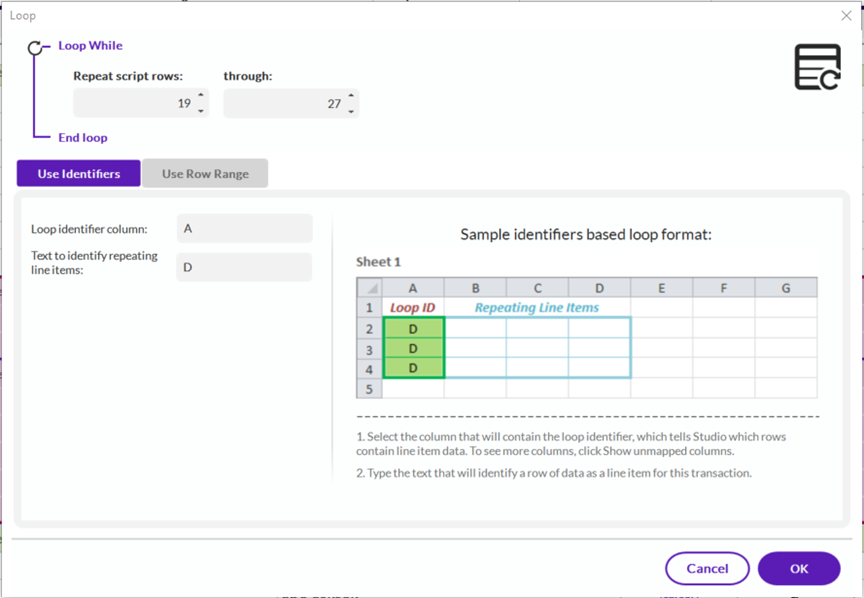 - If the script needs a loop, you will have two options for the line items. The first option is to use identifiers. This will require "D" or whatever you specify to indicate a line item row. The second option is to use a row range where you specify the start and end of the line items in the spreadsheet. For my sales order example, the line items start on row 11. Here are screenshots for both: