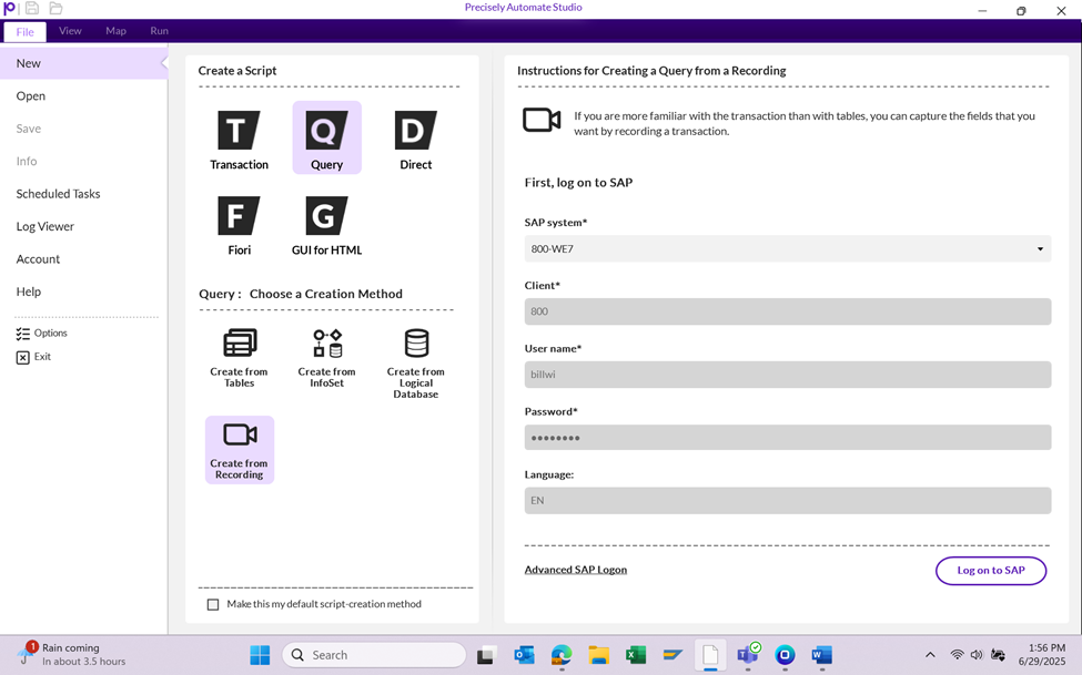 Choose the creation method and log on to SAP