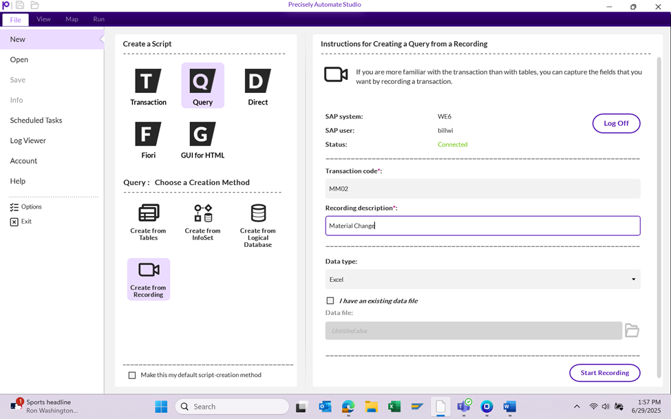 Create a Query from a Transaction Recording