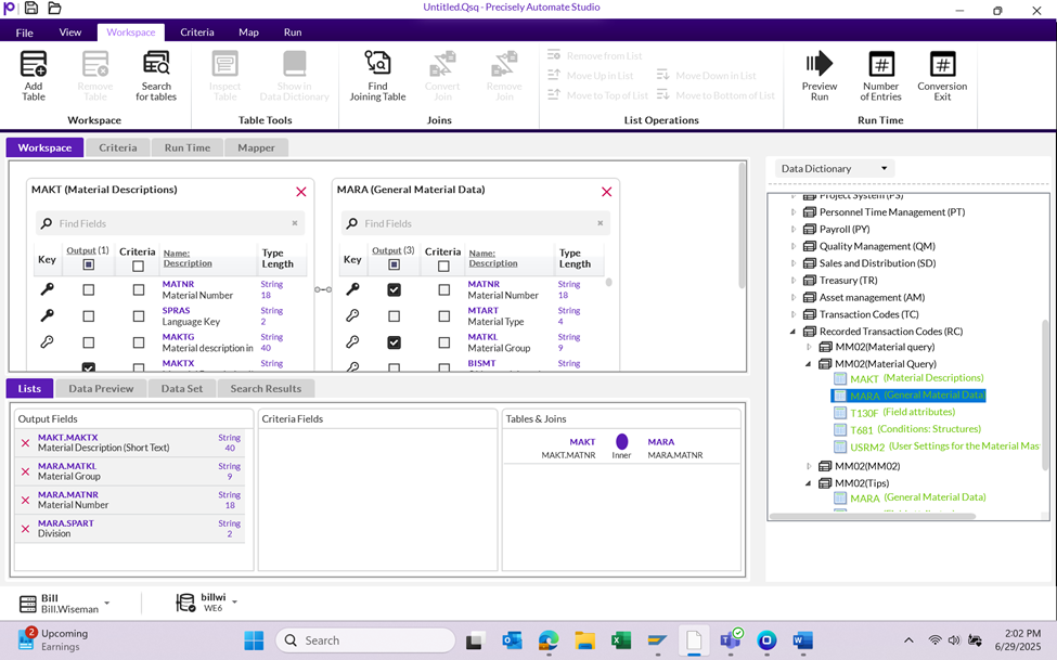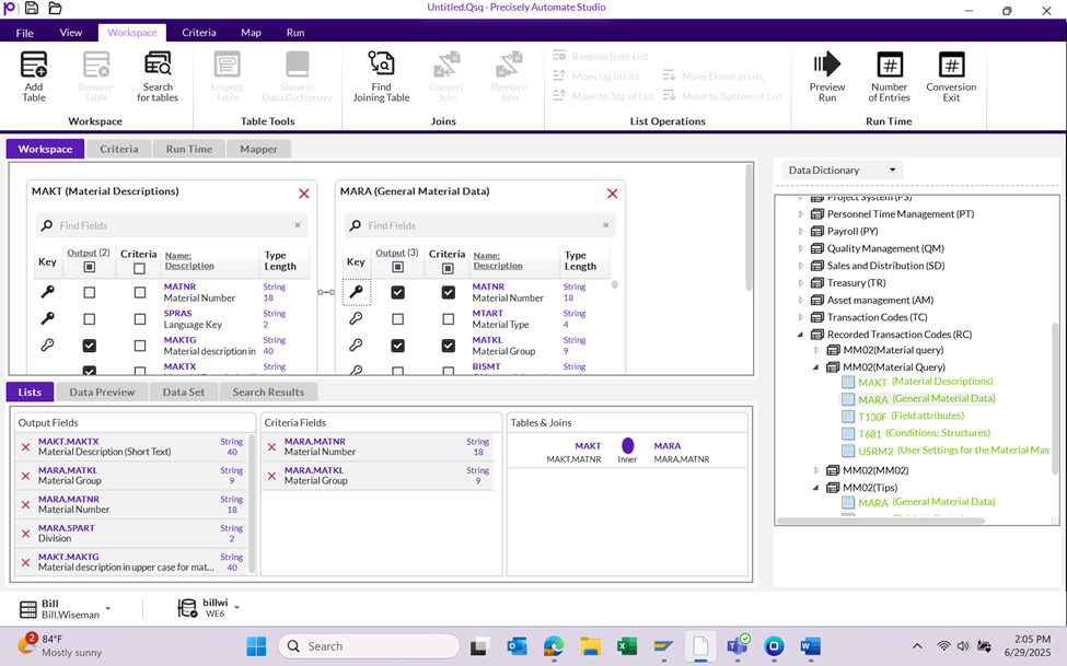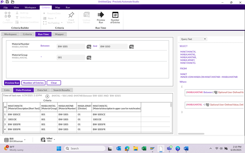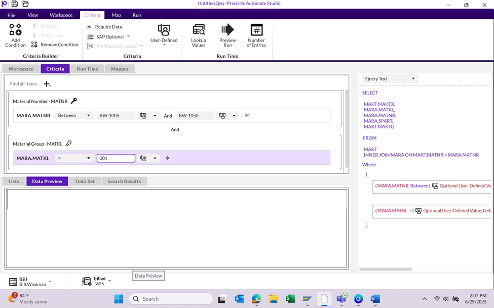 For example, if you want to tell Query to return material data based on a range of material numbers, check the Criteria box for the MARA.MATNR field.