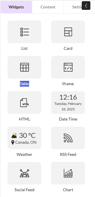 - Next, add Widgets to your canvas. Click a Widget to add it to your canvas. Use your mouse to resize or move the widget around your canvas. See the Widgets online help for more details. There are many different types of Widgets available.