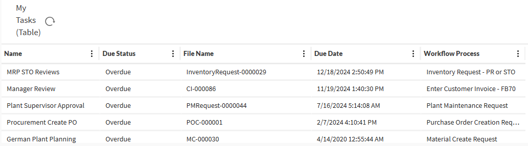 - Table - Do you want to show items in a table. You can bring in things like Evolve Tasks that make it easy for your users to see what is assigned to them. Example: (ignore all my past due tasks - it's a demo system after all ;-) ).
