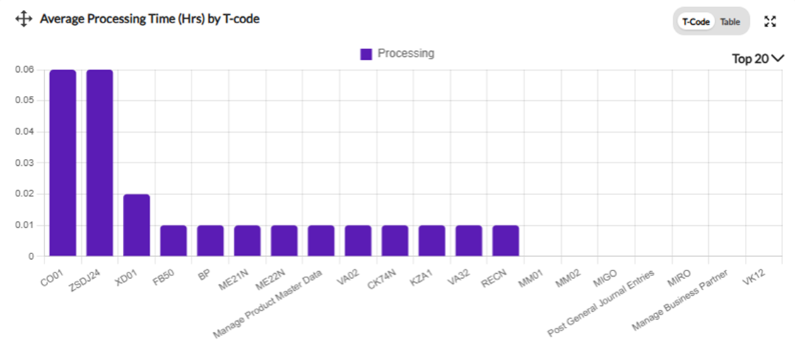 The lower left chart is Average Processing Time (Hrs) which can be viewed by T-Code. There is also an option to view by Table which shows the average processing time for Query scripts by table: