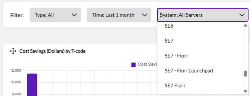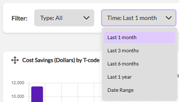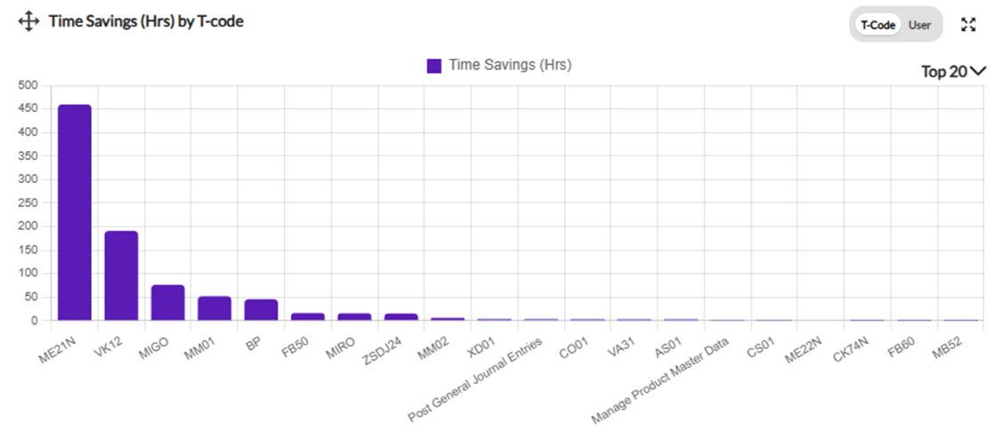 The upper right chart is Time Savings (Hrs) which can be viewed by T-Code or by User: