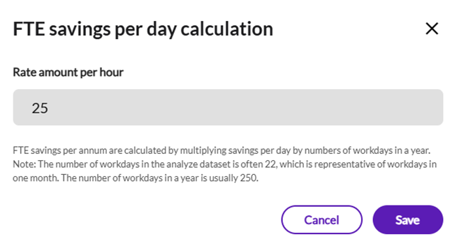 The upper left chart is Cost Savings (Dollars) which can be viewed by T-Code or by User. There is also a settings icon where you can change the rate amount per hour used to calculate the FTE savings per day (the default is 25):