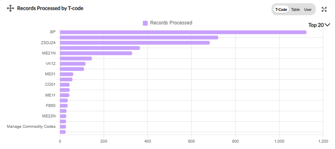 The middle-right chart is Records Processed by T-code which can be viewed by T-Code or by User. There is also an option to view by Table which shows the Query records extracted by table:
