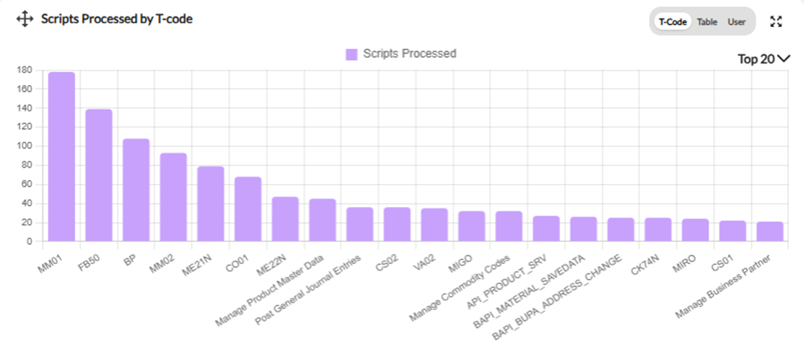 The middle-left chart is Scripts Processed by T-code which can be viewed by T-Code or by User. There is also an option to view by Table which shows the Query scripts processed by table:
