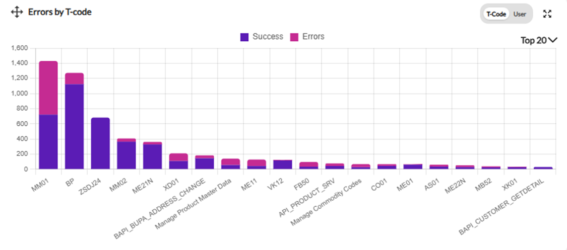 The lower right chart is Errors by T-code which can be viewed by T-Code or by User. The chart shows the number of success records in purple and the number of error records in pink: