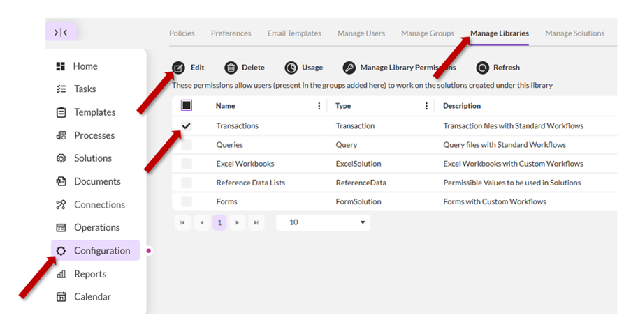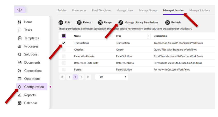 - Click the library permissions category (Library Solutions or Processes) you need to edit.