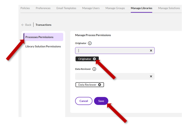 - Click the library permissions category (Library Solutions or Processes) and then select groups for different permission levels like Originator, Solution Reviewer etc.