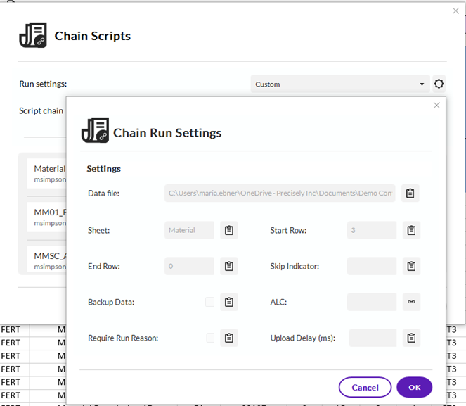 - Check the run settings for each script. For example, if the start row should be 2, make sure it's 2. I've seen where the start or end row was changed while testing and they need to be changed back before chaining. I've done this to myself many times!