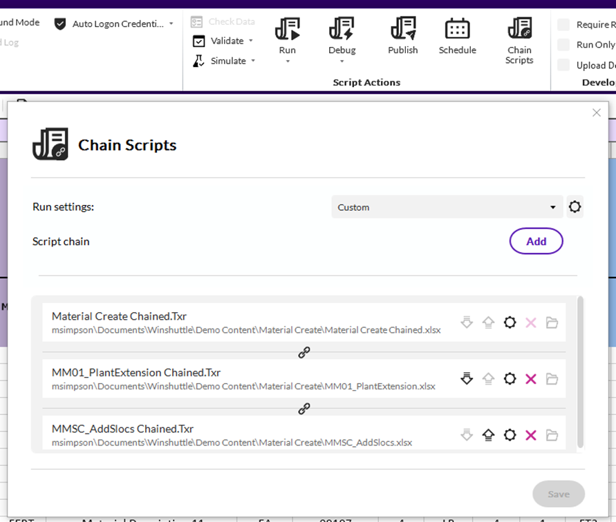 - Choose the appropriate run settings for the scripts. You can choose "All from first script", "All from individual scripts", or "Custom". For the screenshot below, custom was chosen because I wanted to use the SAP logon (ALC) from the first script and the sheet and start row from the individual scripts. Click the settings button next to custom to make changes to the custom run settings.