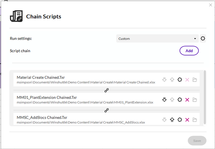 Chaining or linking scripts is used to automate an SAP process that requires running multiple scripts. For example, if you need to create a material, extend it, create a BOM and routing, etc., you can chain all those scripts together. Once the scripts are chained, click the run button on the first script and it will automatically run all the scripts in that chain. This can save a lot of time if you need to run multiple scripts and there is no limit to the number of scripts you can link. I was impressed to find out that Columbia Sportswear chained together 148 scripts to automate SAP testing!