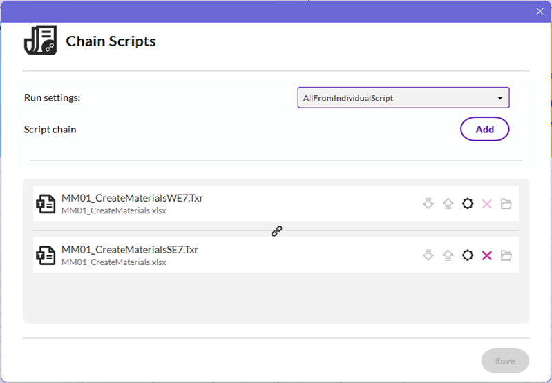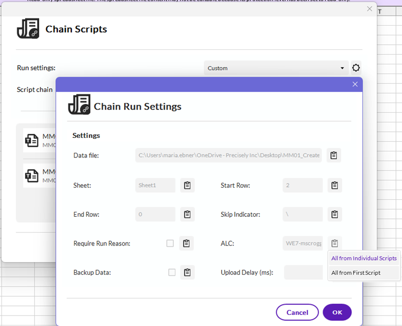 - Chain the scripts together. For this example, we're only chaining two scripts (the same script but different names and SAP systems) to upload into two SAP systems, but you can do as many as you need. To chain the scripts, open the script you want to run first, go to the Run tab, and click "Chain Scripts" in the ribbon. Select the second script you want to run and for the Run settings choose either "All from Individual Scripts" or "Custom". If you choose "Custom", make sure you leave the ALC to "All from individual scripts". "All from First Script" will not work in this scenario because it will use the SAP system from the first script to run subsequent scripts.