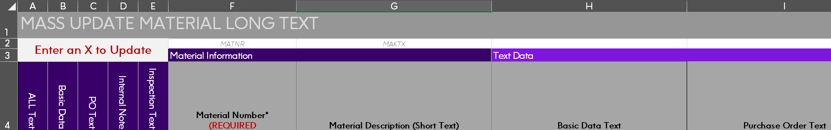 - Note: For each long text type, there should be a condition for an X in column A and an X in the corresponding column for the individual text type.