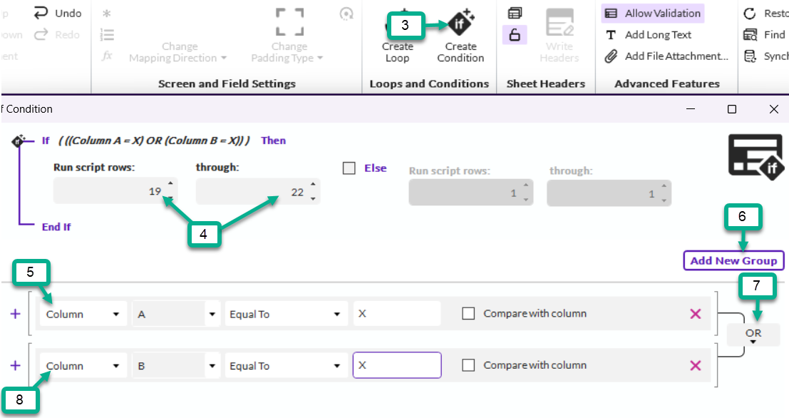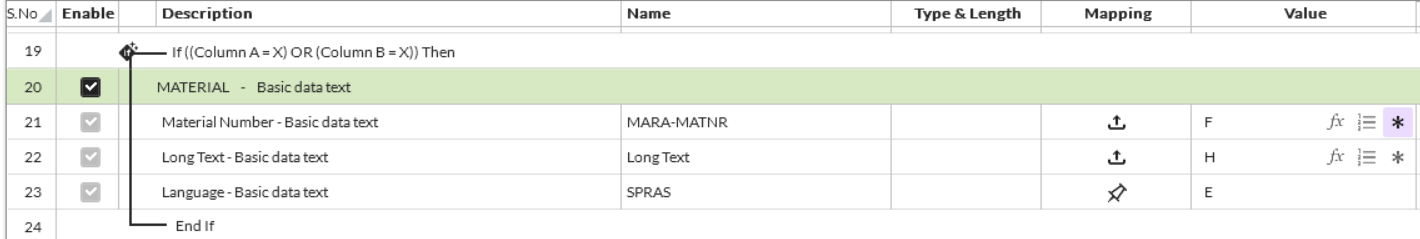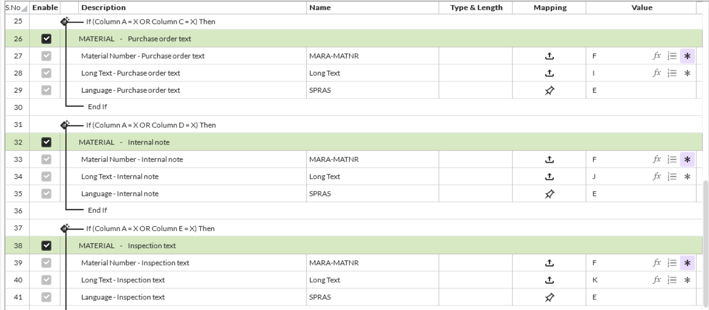 Now…let's add some extra functionality. In the attached sample Excel template, we have material long text for four types of long text all in one template (Basic Data, PO Text, Internal Note, and Inspection Text). You may want to give your users the option to update none, some, or all the text on each row. This can be accomplished by adding if conditions in your script mapped to columns on your template. In the example below, we are using columns A - E to allow the user to determine what text gets updated.