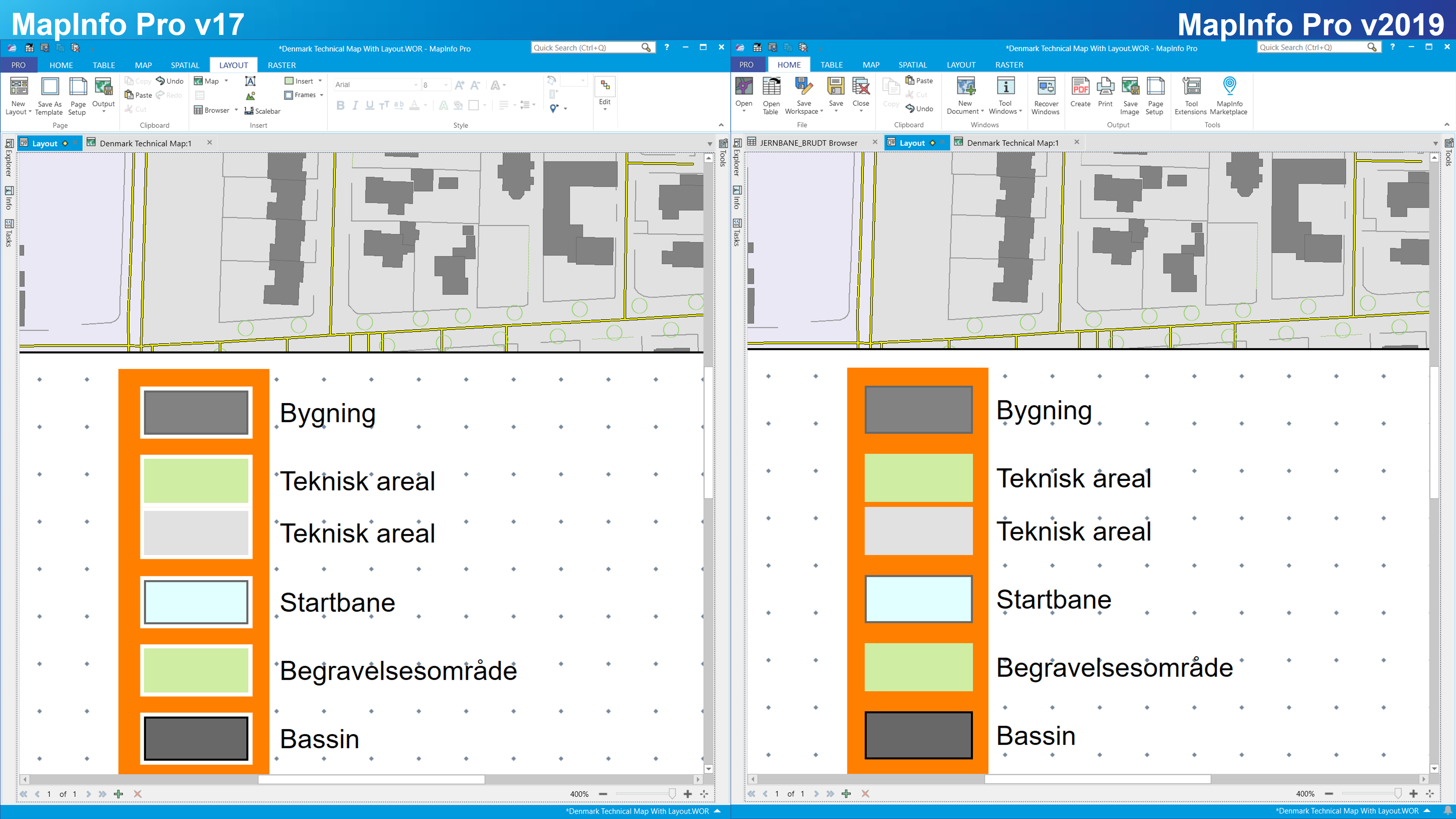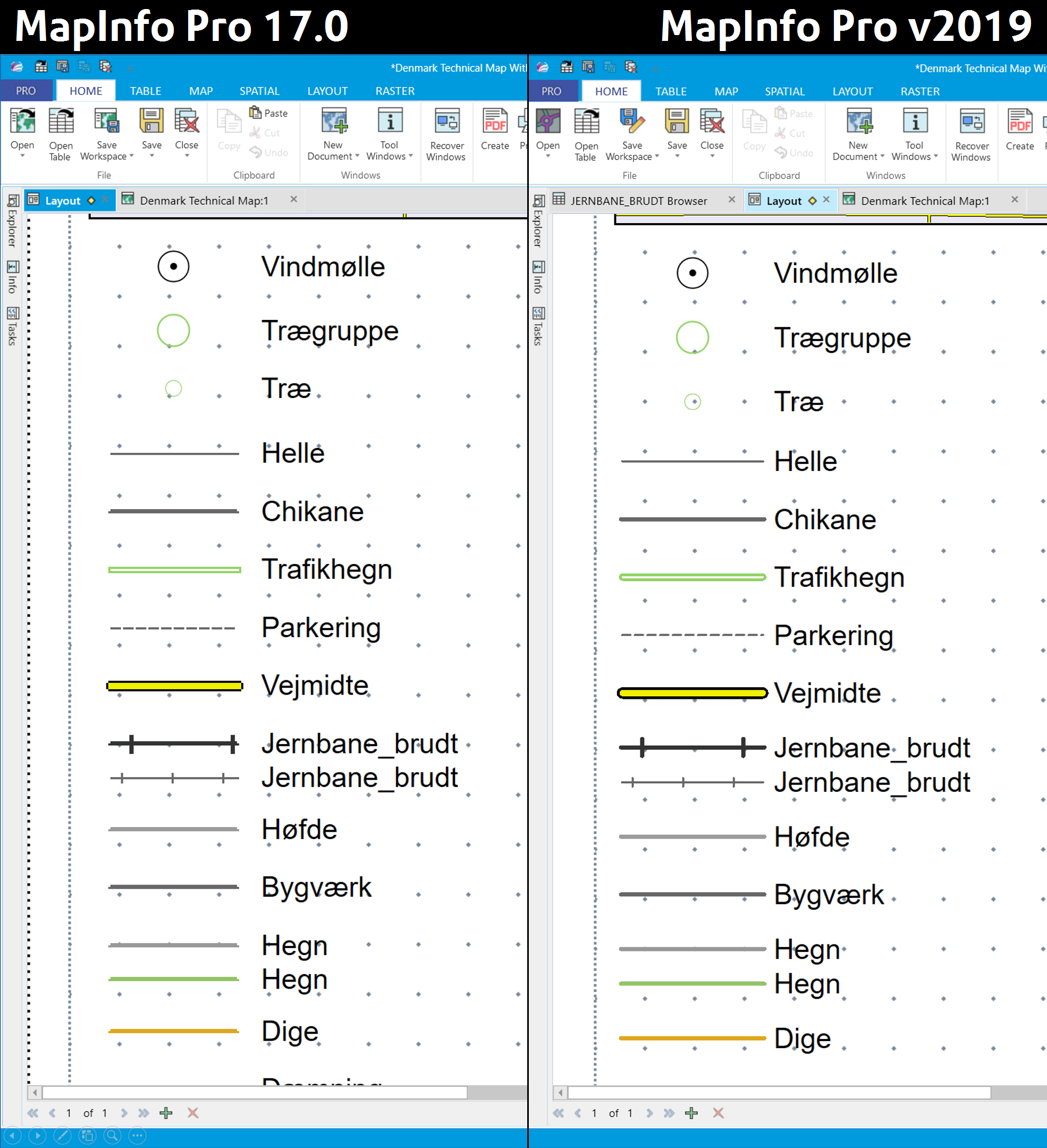 Below you can see two examples of legends in a layout where the left example is from MapInfo Pro v17.0 and the right is from MapInfo Pro v2019. Especially the thick and more complex line style now looks a lot better.