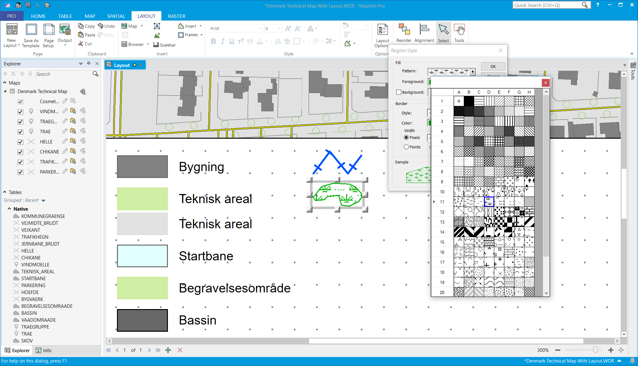 In the image below, you can see how I'm now able to select the region hatch pattern that I want from the Region Style dropdown. In the layout, I have already assigned a "simple railroad" style to my free-form polyline and a Marsh-like style for my free-form polygon.