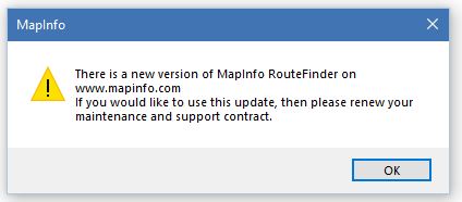 Hi, I'm running the latest MapinfoPro 2019.2 (64 bit) and have recently upgraded to Routefinder 6.02, it seems to be working fine but I still get the following message every time I start it up.