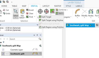 This is definitely different from the Split Region tool in MapCAD in Mapinfo 15 32bit. That one was very easy to use. You just selected an object in an editable layer, selected the Split Region tool and drew a line through the object. It then split the polygon there and then. Great tool as it circumvented the whole palaver around drawing your polyline first and setting targets objects etc.