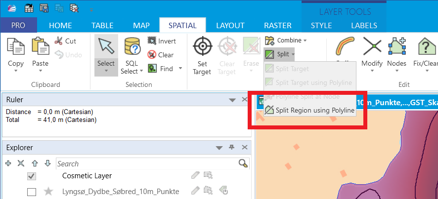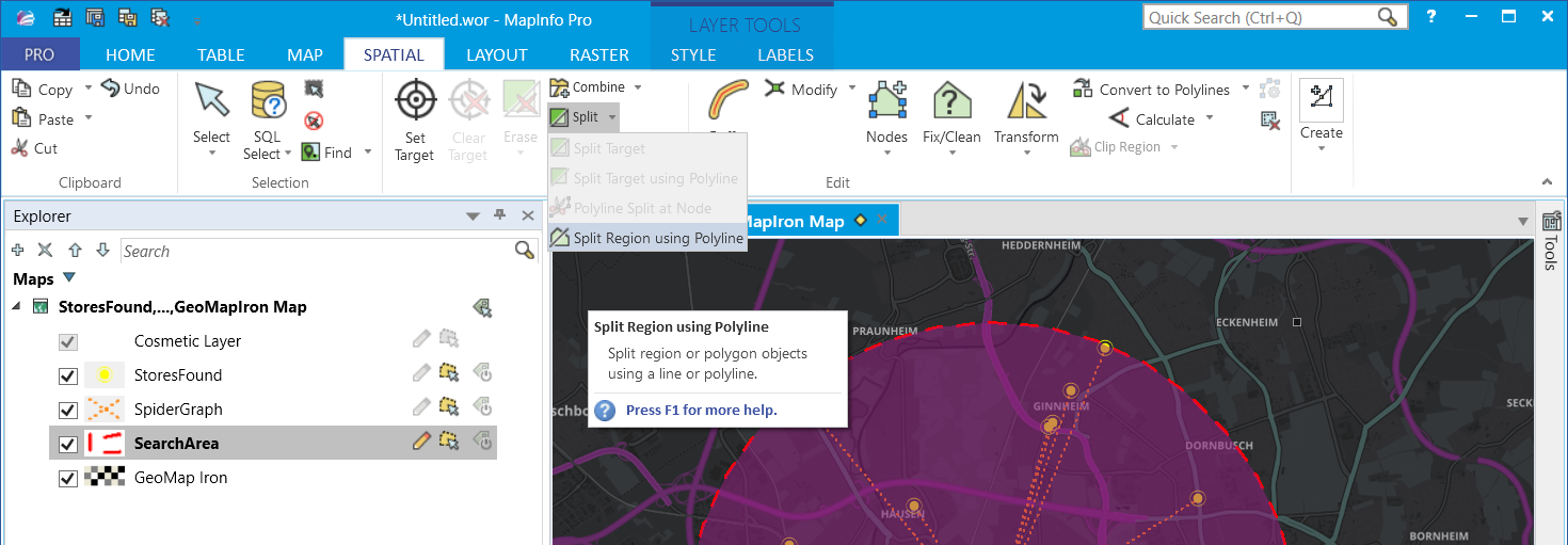 Where is the Split Region tool (or an equivalent) in Mapinfo Pro 17 (64 bit).